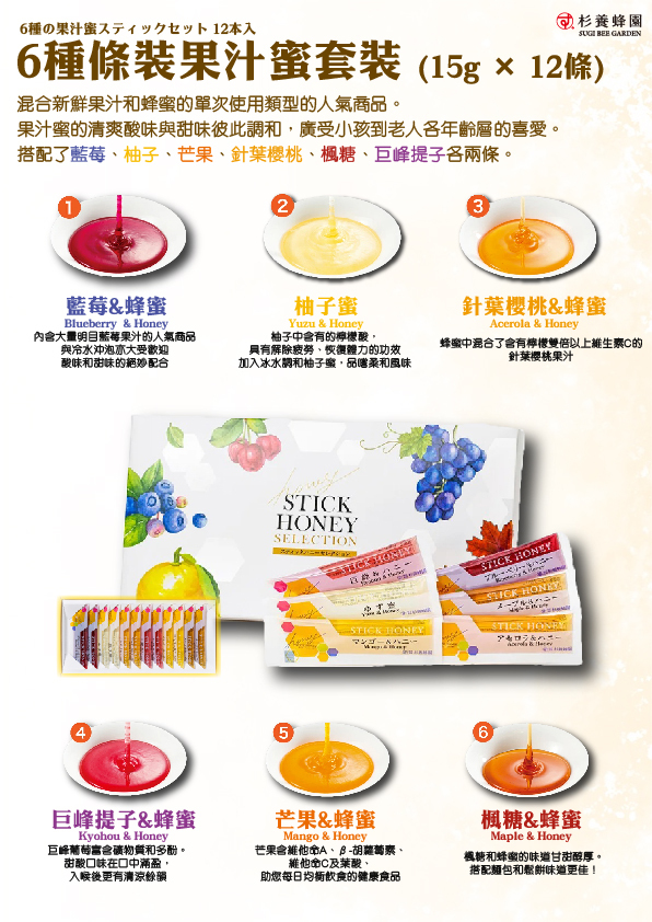 | Ingredients | Acerola & Honey: Refined honey (manufactured in Japan), Acerola juice/Citric acid, Thickener (pectin), Flavoring Kyohou & Honey: Refined honey (manufactured in Japan), Grape juice/Citric acid, Thickener (pectin), Flavoring Yuzu & Honey: Refined honey (manufactured in Japan), Yuzu juice/Citric acid, Thickener (pectin) Blueberry & Honey: Refined honey (manufactured in Japan), Blueberry juice/Citric acid, Thickener (pectin), Flavoring Mango & Honey: Refined honey (manufactured in Japan), Mango juice/Citric acid, Thickener (pectin), Flavoring Maple & Honey: Refined honey (manufactured in Japan), Isomalto-Oligosaccharide, Maple syrup/ Flavoring, Caramel coloring |