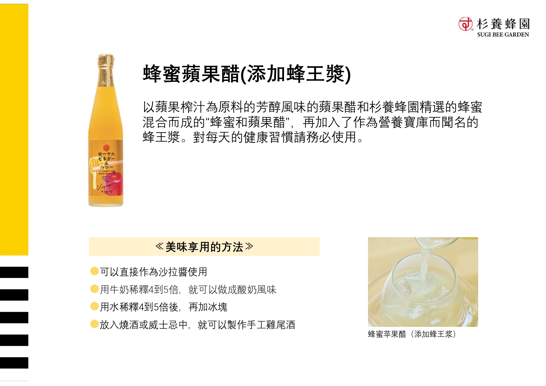 A luxurious blend of honey apple vinegar and royal jelly.Vinegar is great to add to your cooking as part of your daily health regimen.
