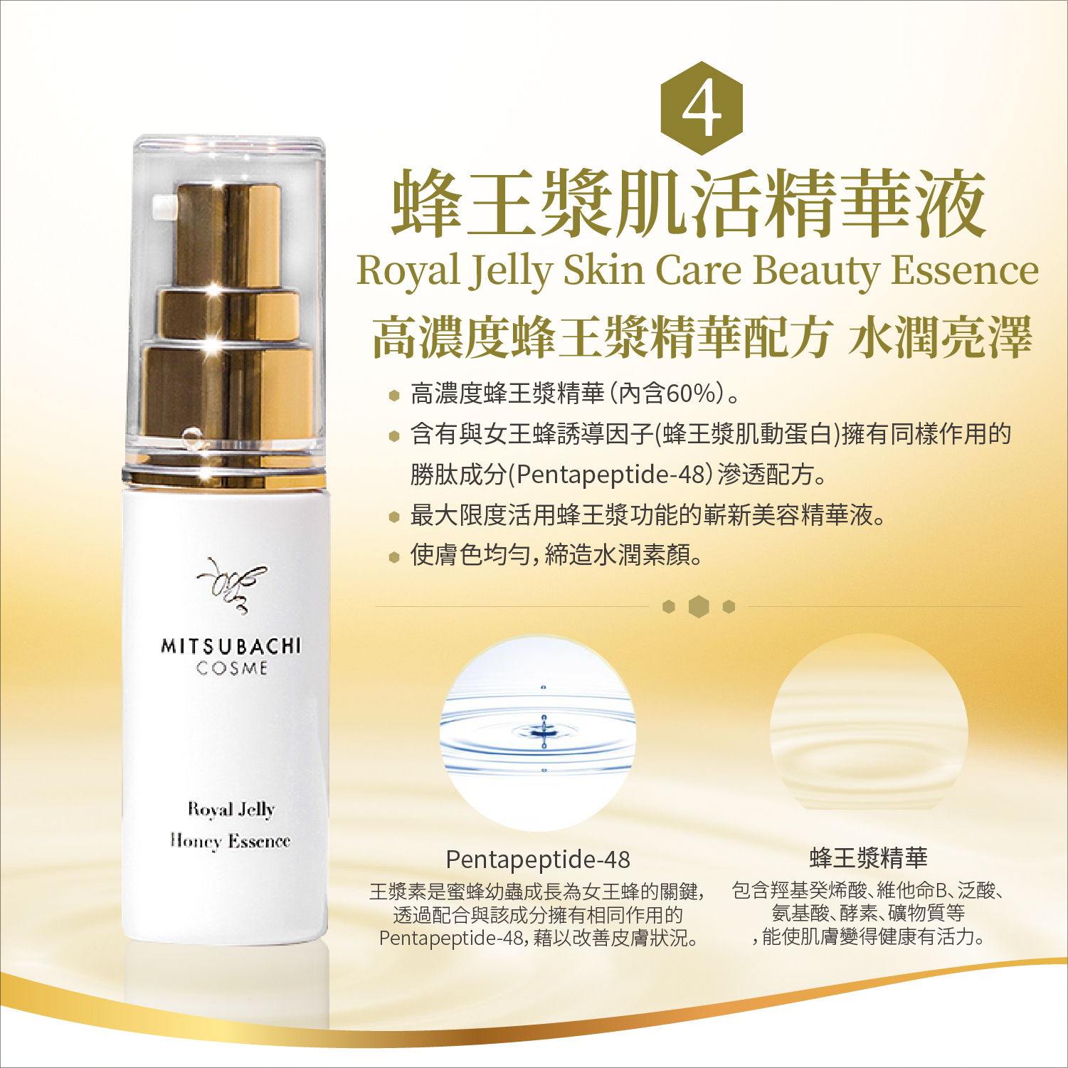 Newly released! MITSUBACHI COSME Royal Jelly Skin Care Beauty Essence.Maximally infused with 60% royal jelly extract.MITSUBACHI COSME, which is Sugi Bee Garden's functional Cosmetics product APIMIEL, loved and purchased repeatedly by many, made to evolve based on a ground-breaking idea, has been released.