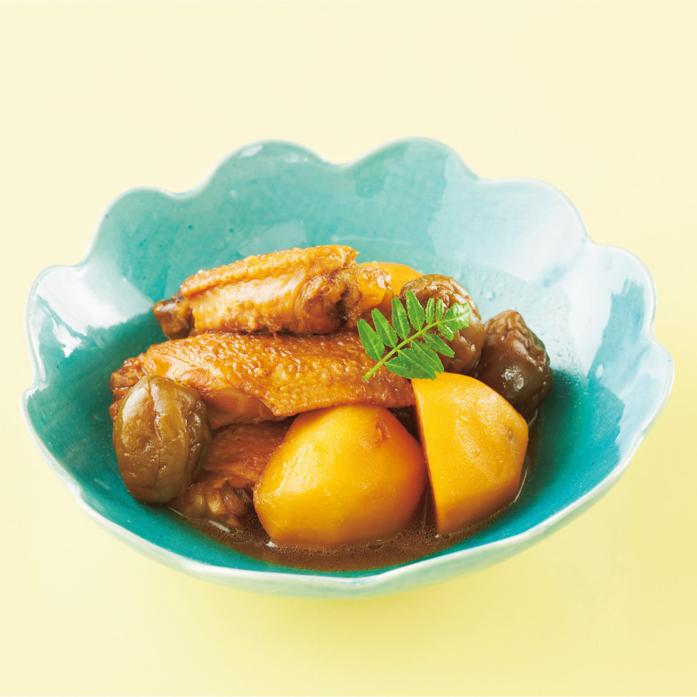 1Peel potatoes, cut in half, and soak in water. For the chicken wings, cut off the wing at the joint and make a cut along the bone.