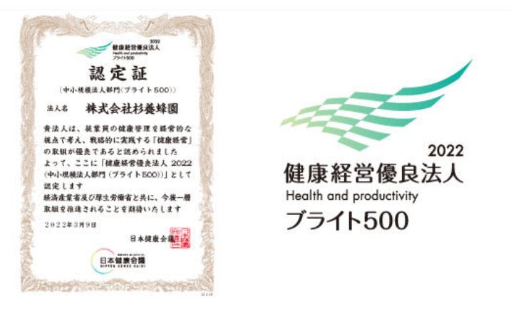 杉養蜂園被選為“全國健康管理優秀企業2021”的500強企業之一,得獎標準包括“從管理角度考慮員工健康“,亦是杉養蜂園提倡管治理念之一,因擁有健康才可持續保持良好工作態度,如養蜂理念,要做到持續發展,蜜蜂健康尤其重要。