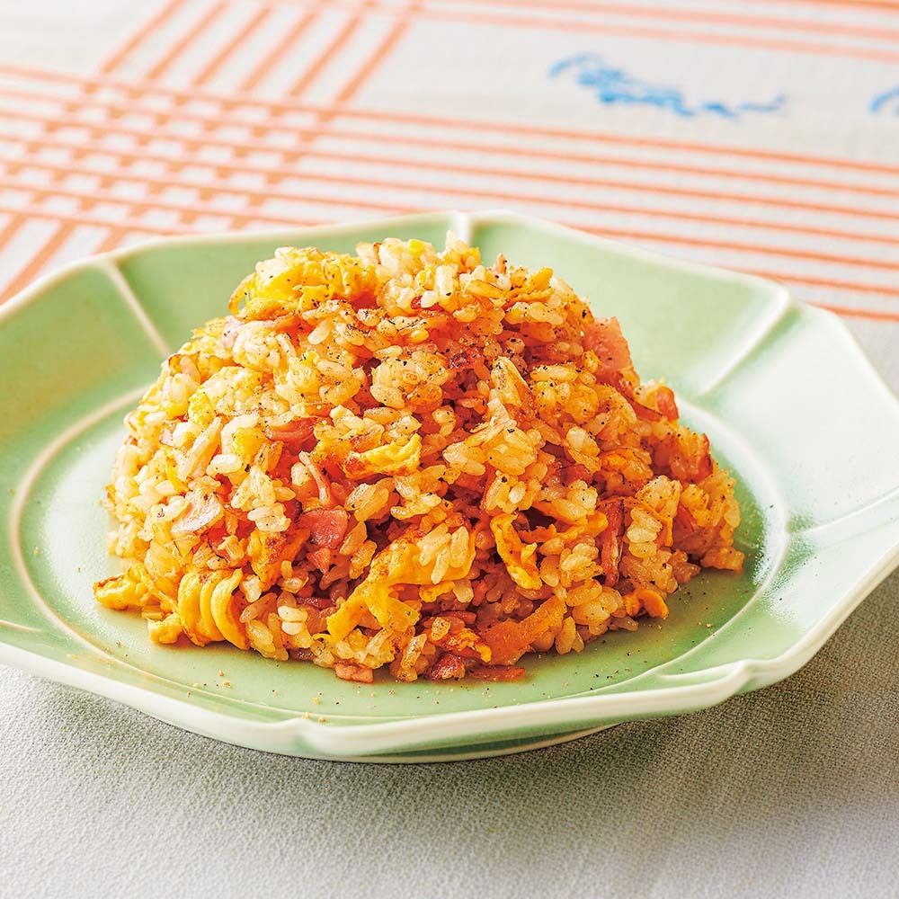 3Heat 1 tablespoon of salad oil in the frying pan in (2). Add the bacon and Ginger Pickled in Honey ginger and stir-fry. When the oil is well incorporated, add the warmed rice and fry quickly until the moisture has evaporated while pressing down with a spatula.