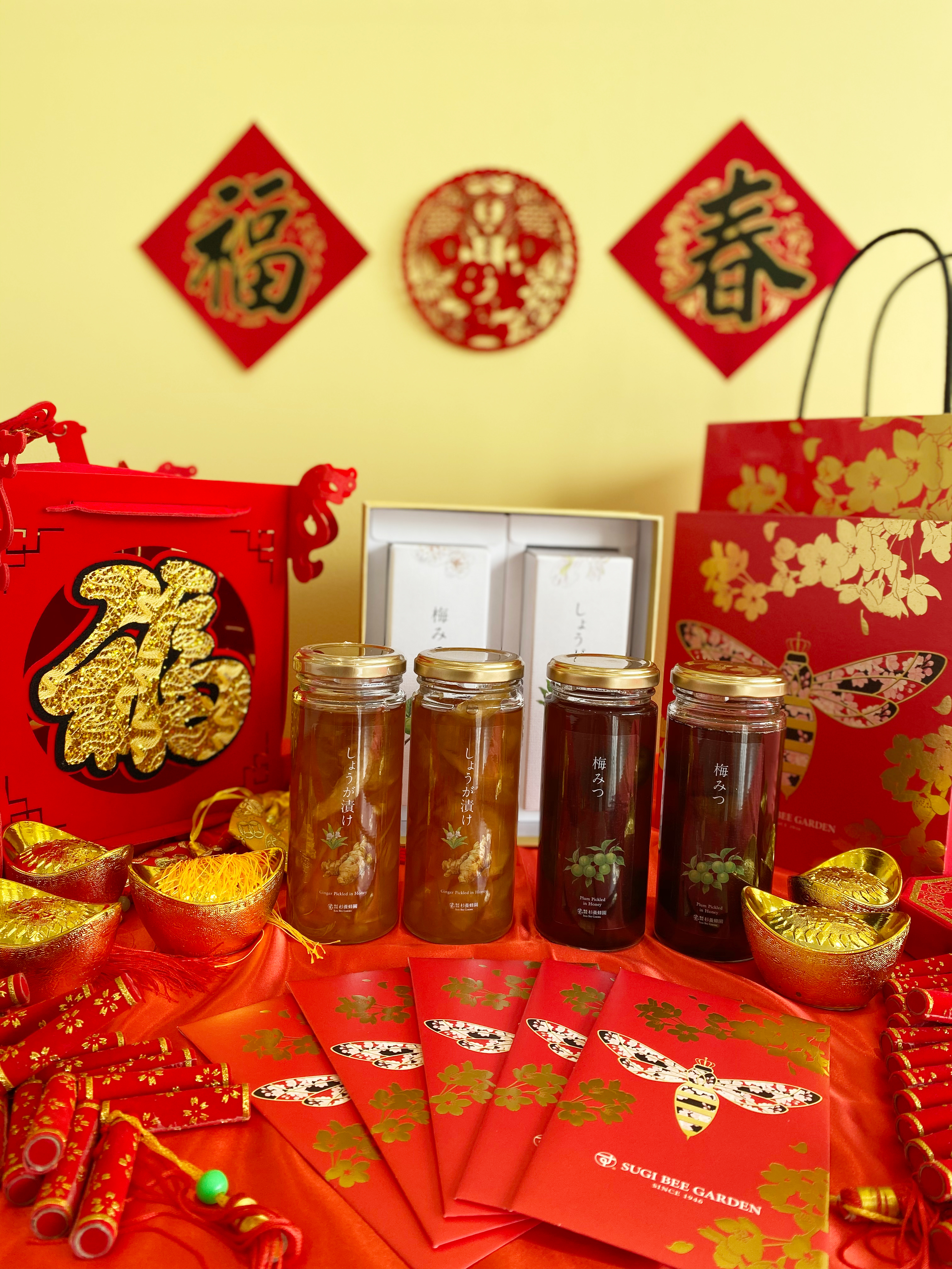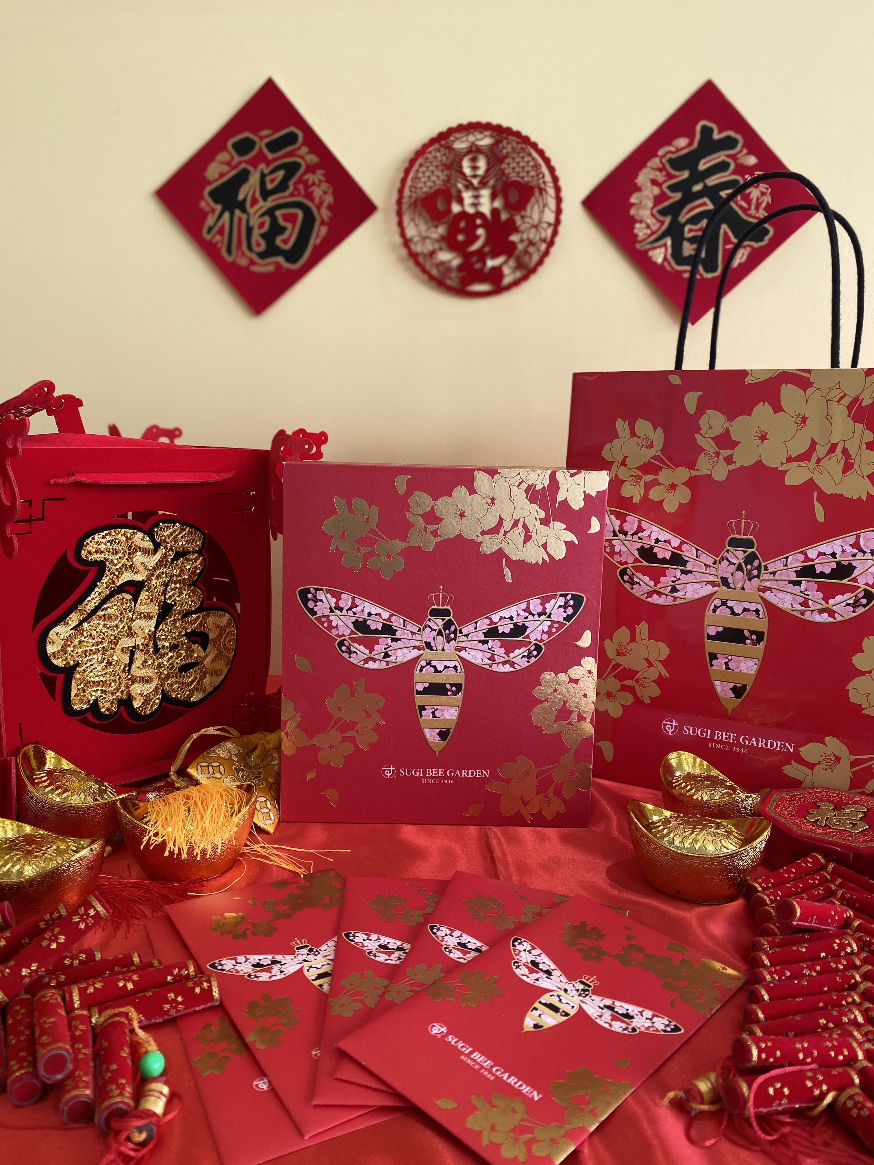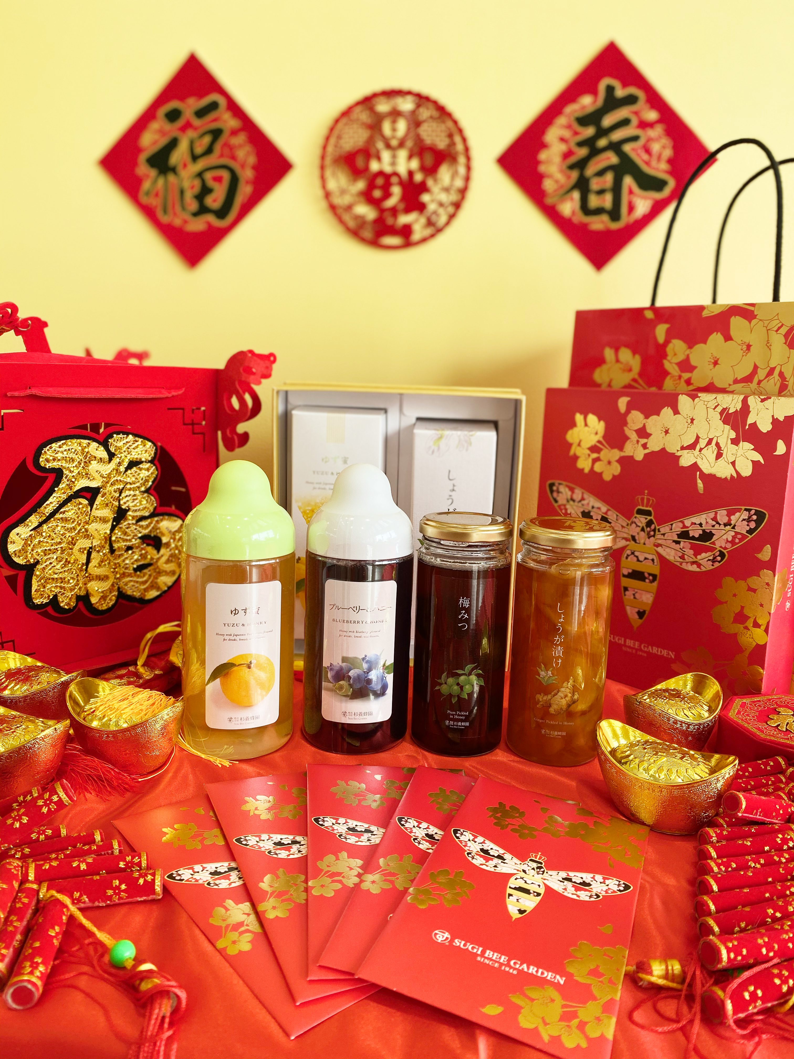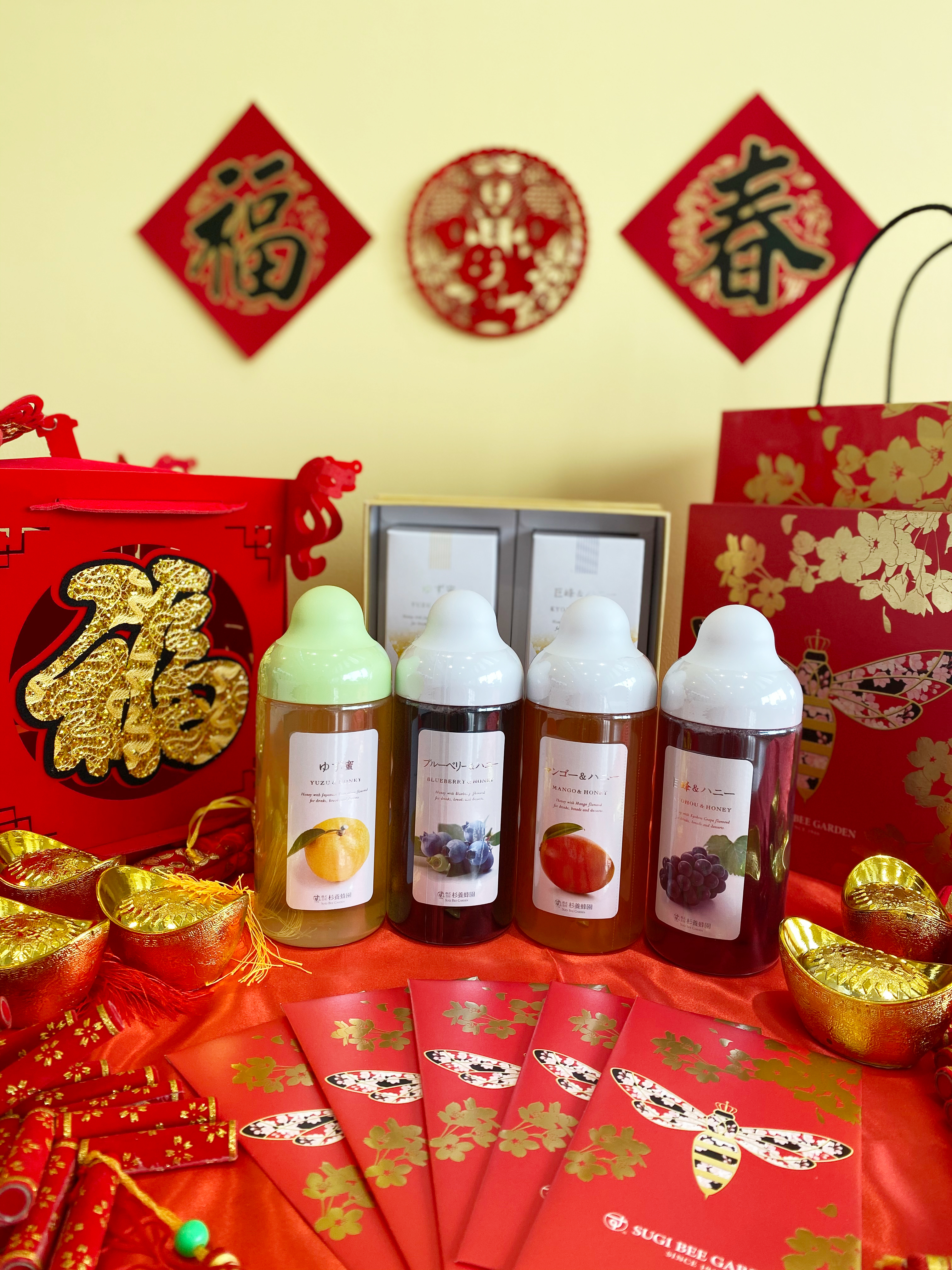 這年特別設計了女王蜂櫻花新春禮盒和紅包袋,櫻花鍍上喜慶的金色象徵來自日本的祝福。
