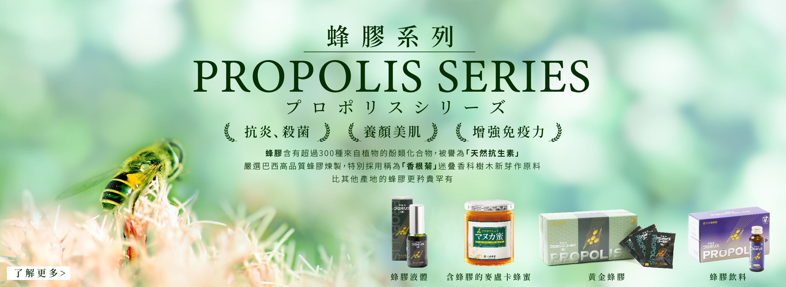 根據探詢所取得的成果,我們從非常優秀的巴西產蜂膠之中,嚴格挑選出擁有優秀自然環境不受空氣汙染、土壤汙染影響的米納斯吉拉斯洲(Minas Gerais)班布伊(Bambui)產蜂膠。