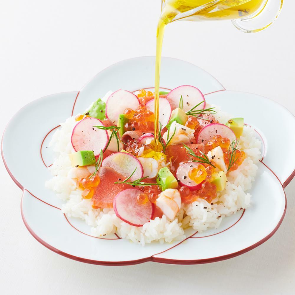 3Place the ingredients on top of the sushi rice, sprinkle black pepper, and drizzle extra virgin olive oil according to your preference to finish up.