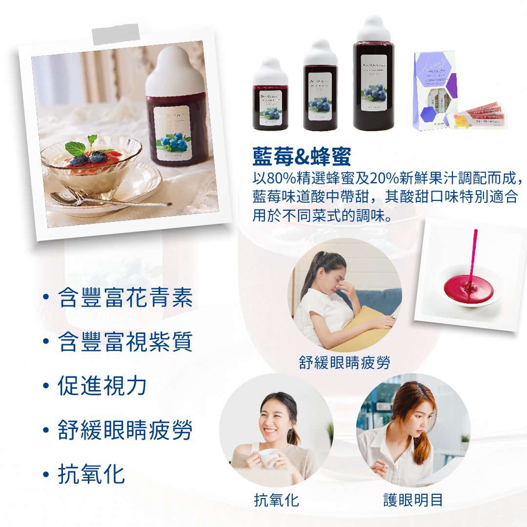 精製蜂蜜、藍莓果汁、檸檬酸、增黏劑(天然果膠)、香料
